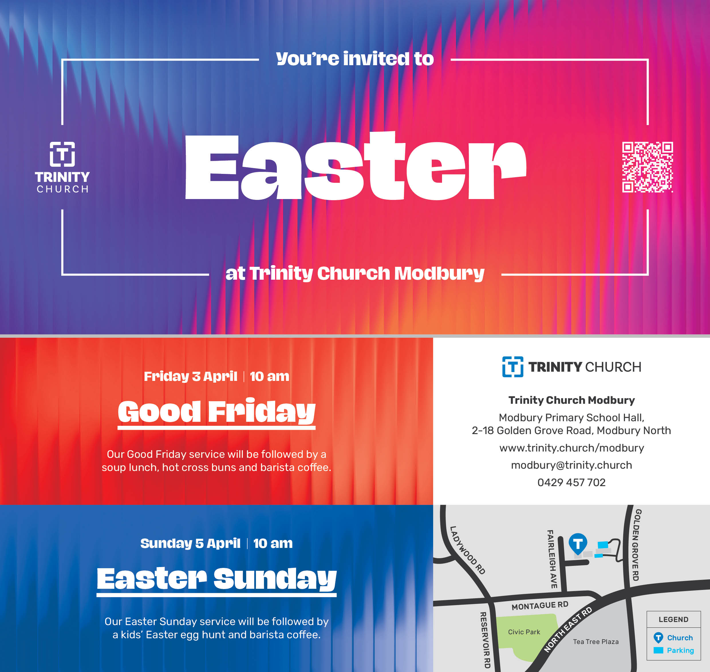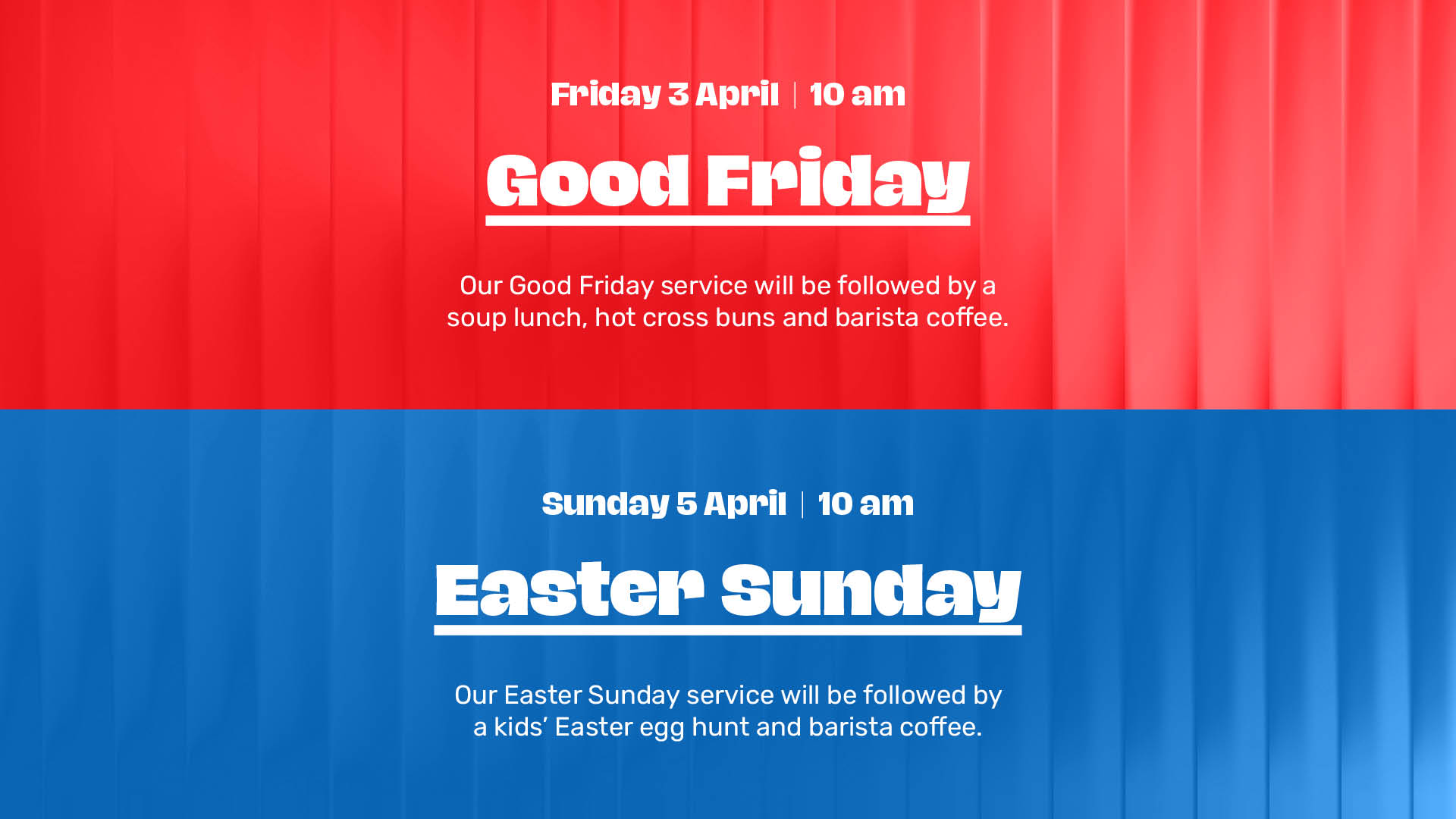 Our Easter Sunday service will be followed by a kids’ Easter egg hunt and barista coffee.